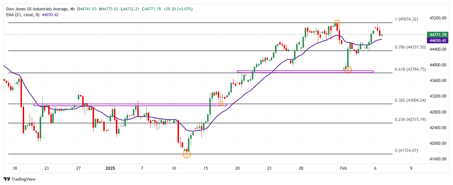 El Dow Jones reaccionó la baja desde una resistencia de corto plazo dada por el máximo del 31 de enero en 45.066. El soporte más cercano lo observamos en 43.848, mínimo el 3 de febrero. La siguiente zona de soporte clave se encuentra en 43.048, punto pivote del 16 de enero.