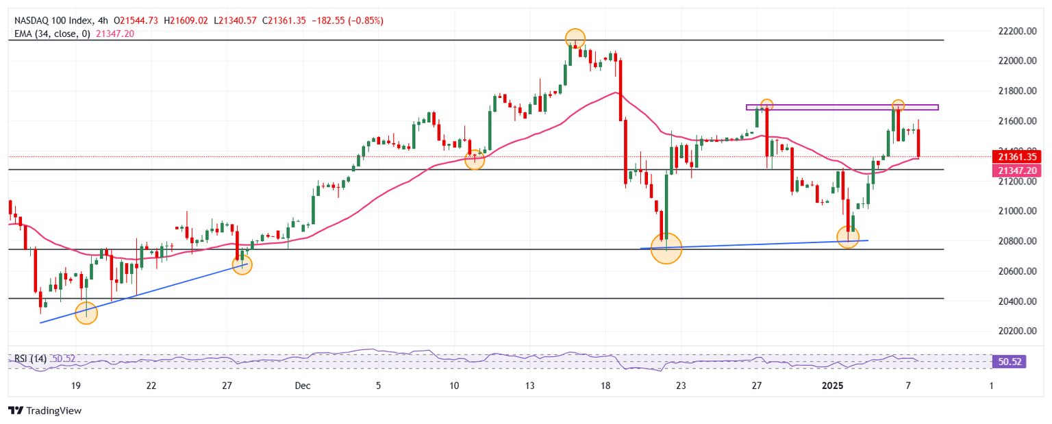 El Nasdaq 100 estableció una resistencia de corto plazo dado por el máximo del 6 de enero en 21.697. El soporte más cercano se encuentra en 20.729, mínimo del 20 de diciembre de 2024en convergencia con el retroceso al 38.2% de Fibonacci. Cuando la siguiente zona de soporte importante está en 20293, punto pivote del 19 de noviembre de 2024.