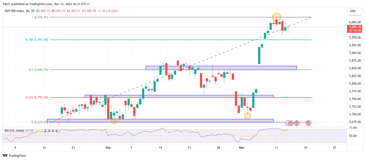 El S&P 500 reaccionó a la baja en una resistencia de corto plazo formada por el máximo histórico alcanzado el 11 de noviembre en 6.017. A la baja, la primera zona de soporte la observamos en 5.850, dada por el retroceso al 50% de Fibonacci y cercano al mínimo del 6 de noviembre. La siguiente zona de soporte clave se encuentra en 5.674, punto pivote del 2 de octubre.