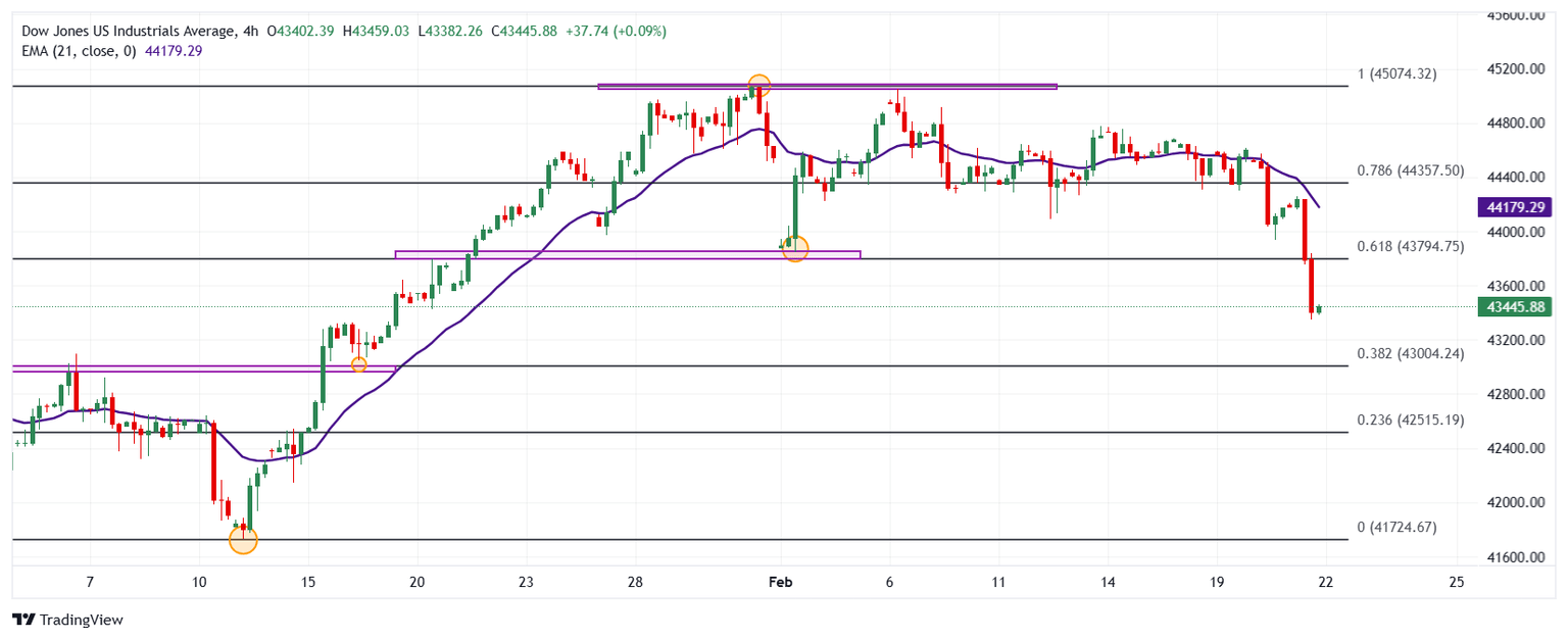 El índice Dow Jones pierde un 1.80% en la jornada del viernes, operando en estos momentos en 43.365, alcanzando mínimos del 17 de enero en 43.345.