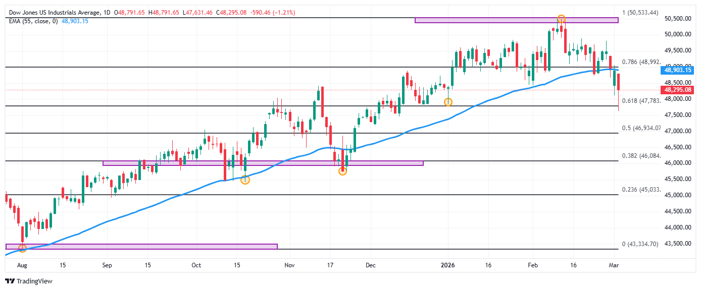 En este sentido, el Dow Jones retrocede 679 puntos, operando actualmente en 48.172.