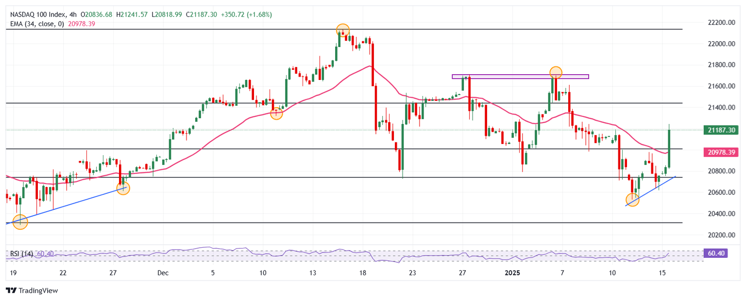 El índice tecnológico Nasdaq 100 sube un 2.17% en el día, operando actualmente en 21.228, llegando a máximos del 8 de enero en 21.241.