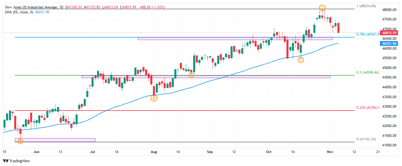 El índice Dow Jones se desliza un 0.93% diario, alcanzando mínimos del 4 de noviembre en 46.813.