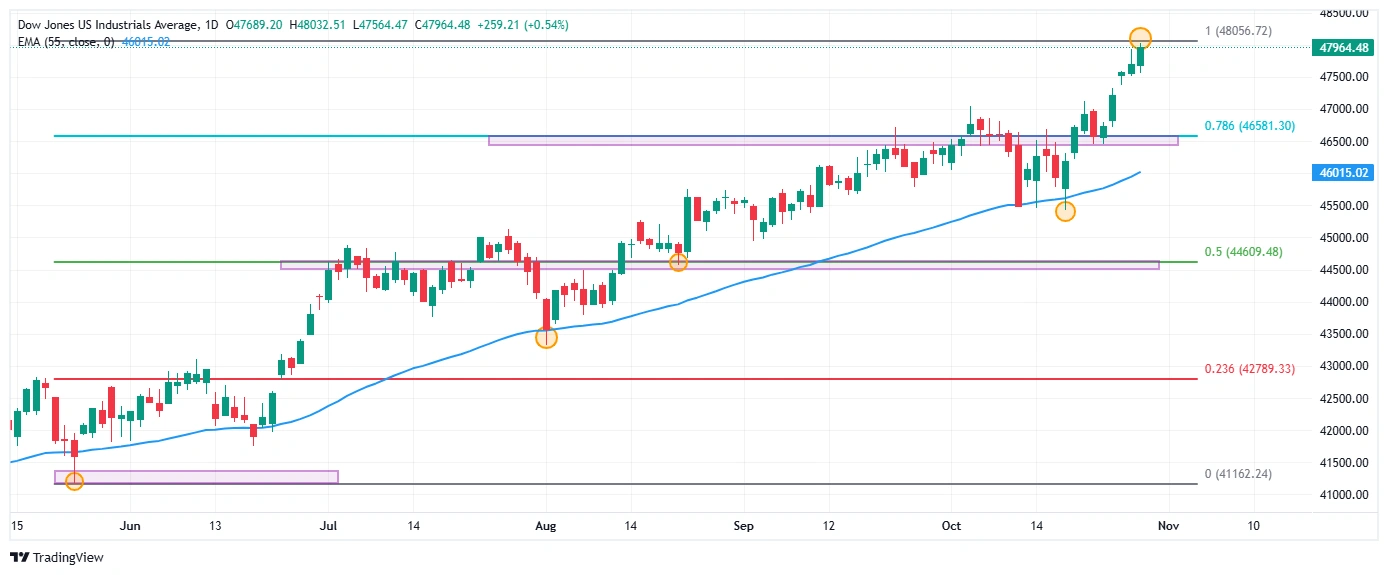 - El Dow Jones repunta un 0.45% en el día, marcando nuevos máximos históricos en 48.032.