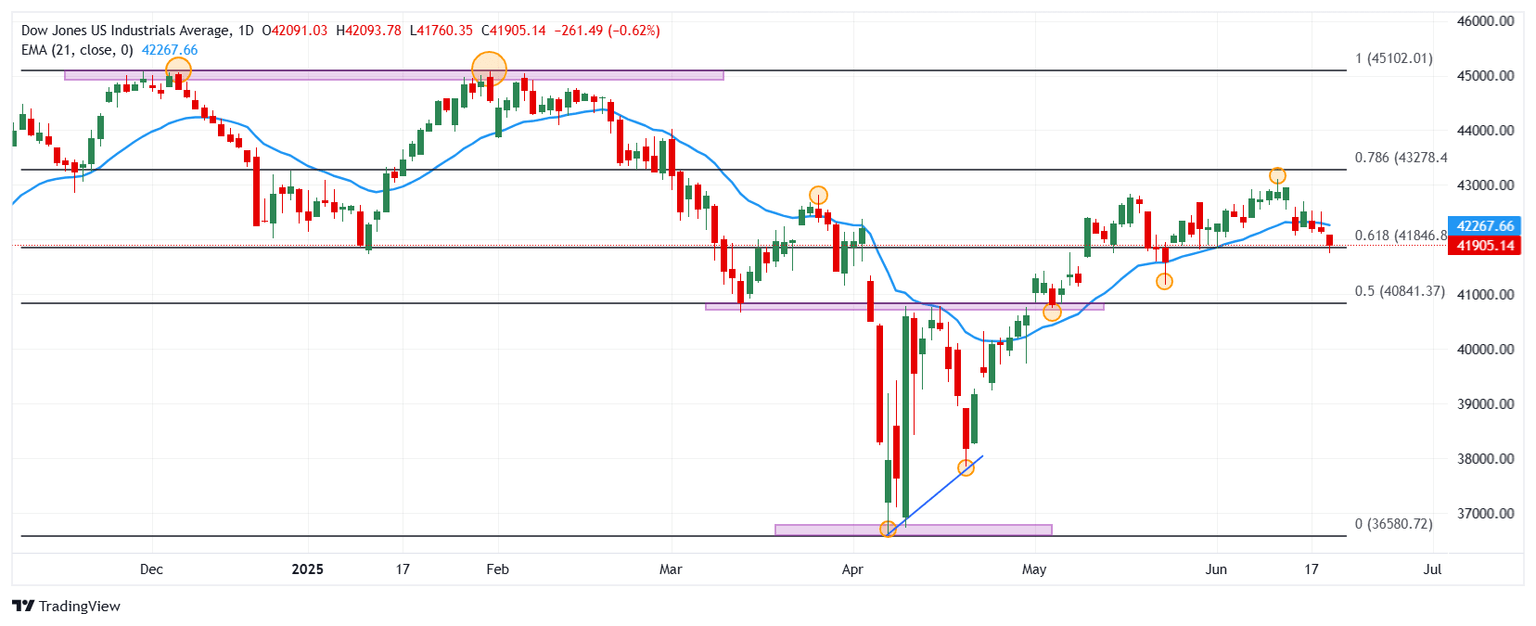 El Dow Jones estableció un máximo diario en 42.093, donde atrajo vendedores que arrastraron el índice a mínimos de cuatro semanas no vistos desde el 23 de mayo en 41.760.