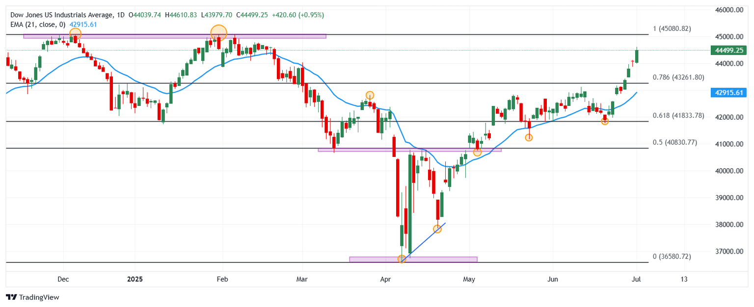 - El Dow Jones avanza un 0.95% en el día, alcanzando máximos del 19 de febrero en 44.610.