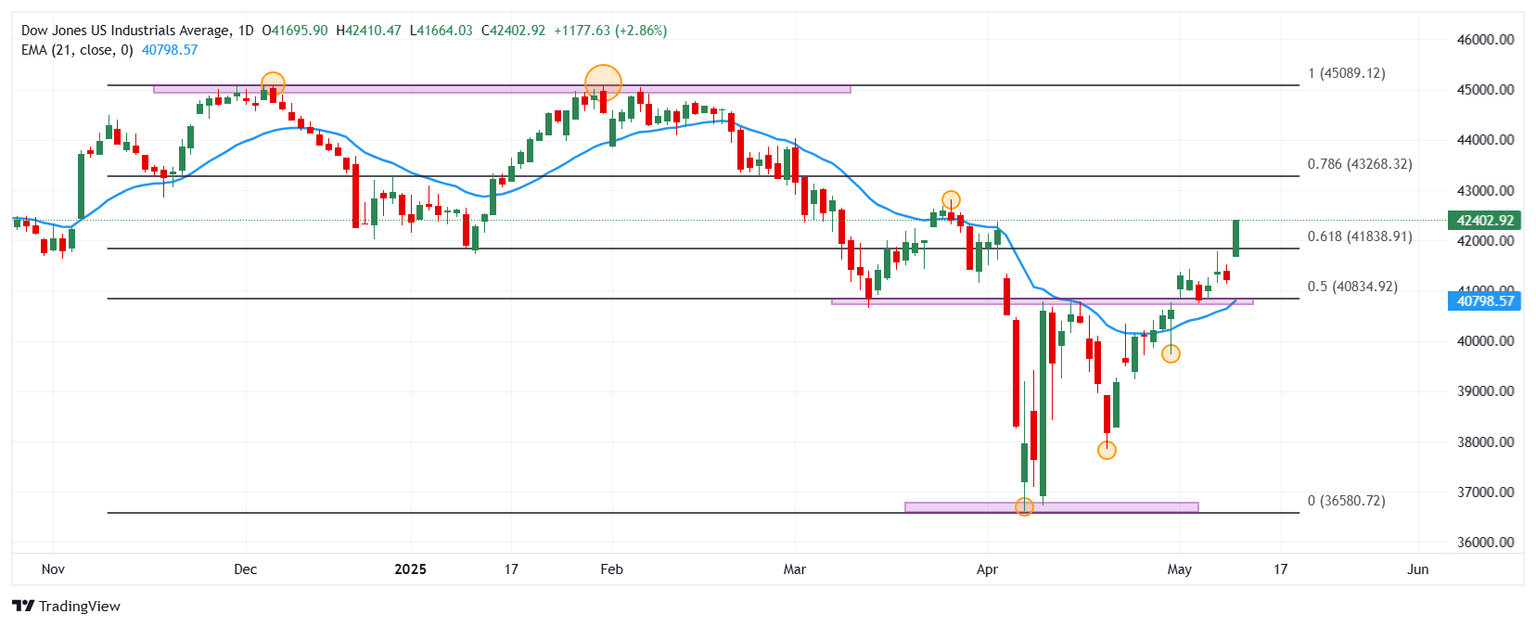 - El Dow Jones repunta un 2.86% diario, alcanzando máximos del 27 de marzo en 42.410.