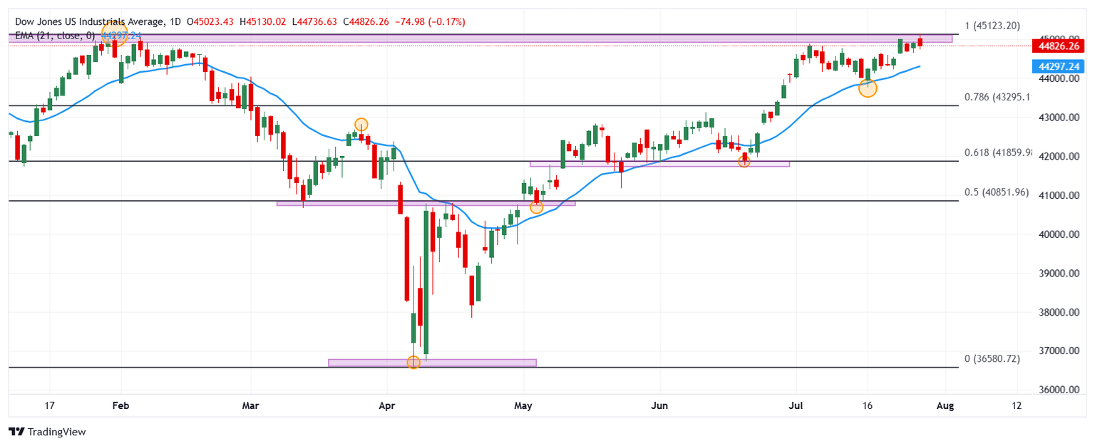 El Dow Jones marcó nuevos máximos históricos en 45.130, donde encontró vendedores agresivos que arrastraron el índice a un mínimo del día en 44736.