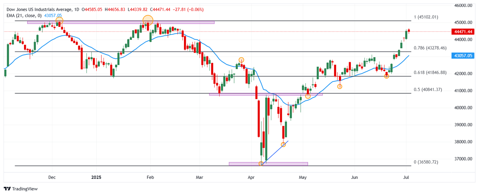 El índice Dow Jones pierden un 0.06% en el día, operando el momento de escribir sobre 44.471.