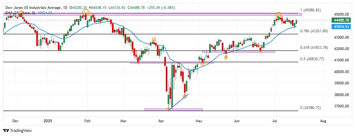 El Dow Jones formó un soporte en 41.760, mínimo del 19 de junio, en convergencia con el retroceso a 61.8% de Fibonacci. El siguiente soporte importante está en 40.747, punto pivote del 6 de mayo. Al norte, la resistencia próxima está en 44.877, máximo histórico alcanzado el 3 de julio.
