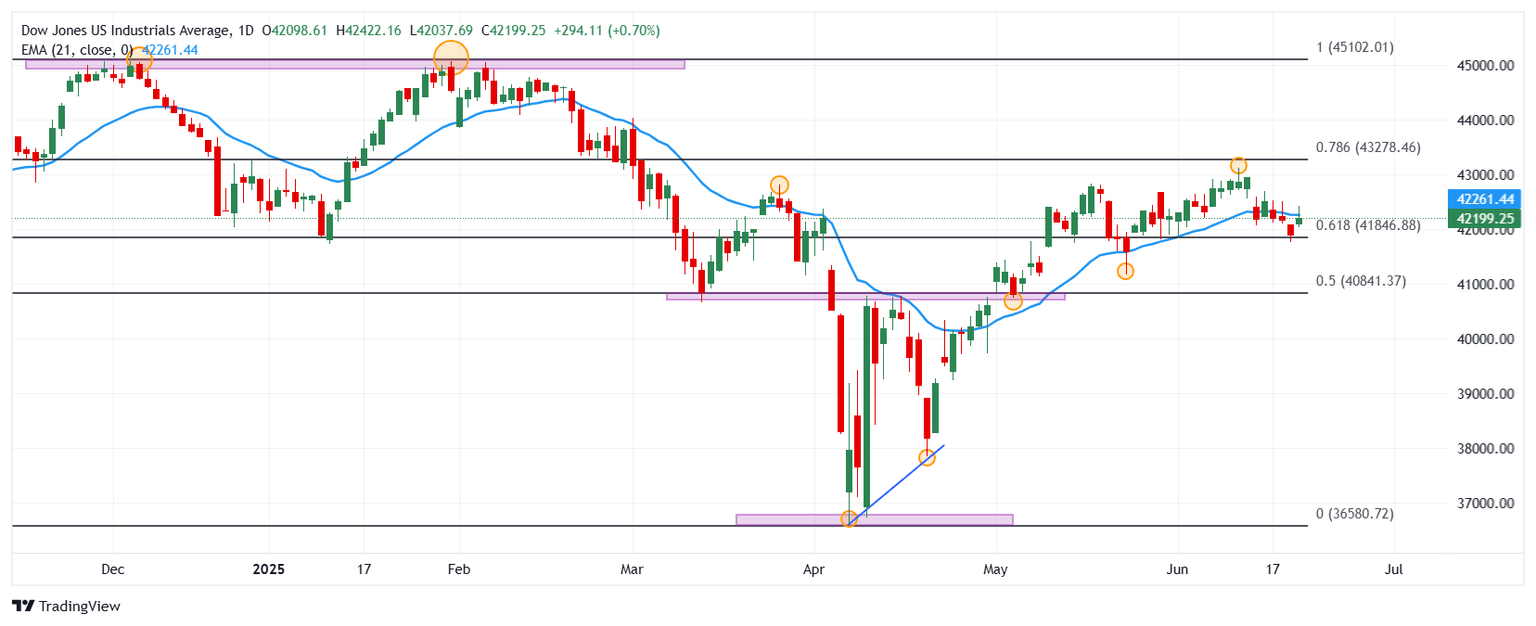 El Dow Jones marcó un mínimo del día en 42.037, encontrando compradores agresivos que impulsaron el índice a máximos de 2 días el 42.422.