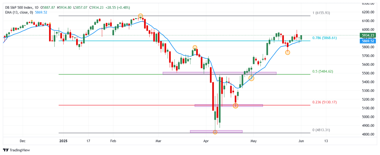 - El S&P 500 sube 0.48% en el día, visitando máximos del 29 de mayo en 5.934.