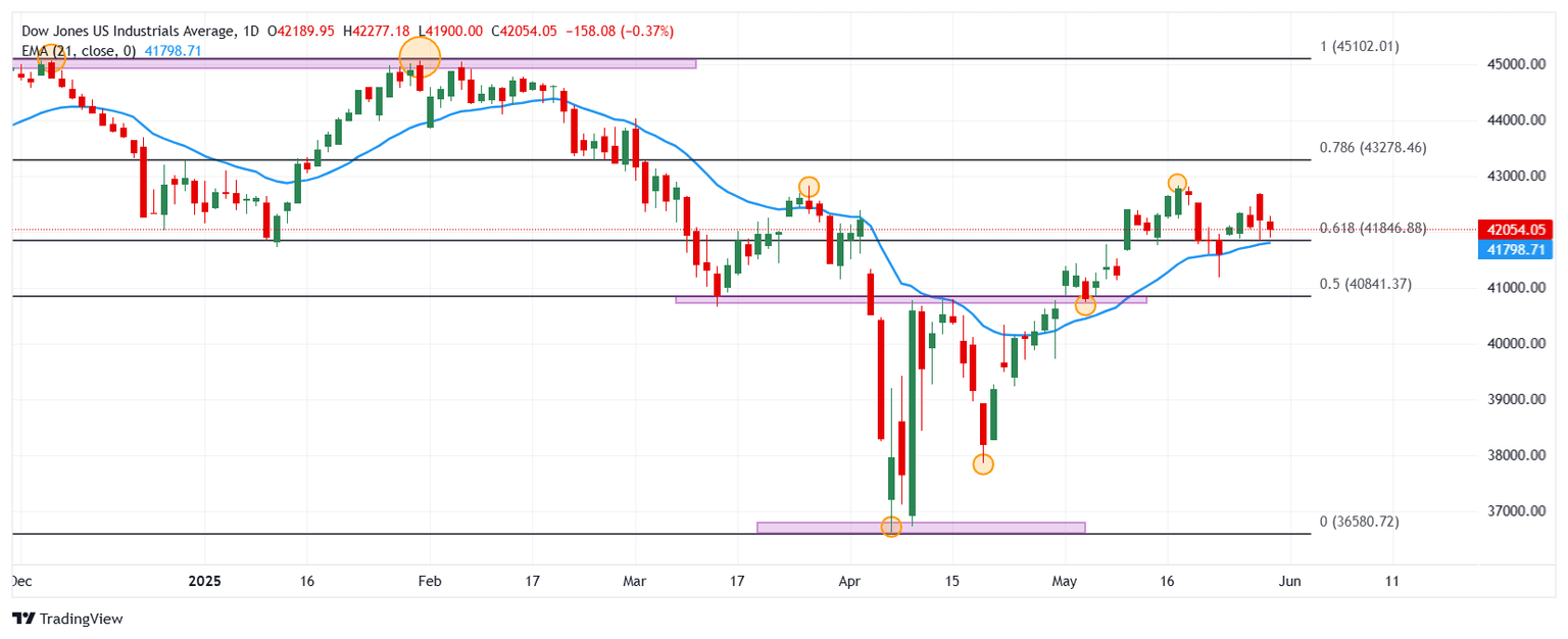 El índice Dow Jones pierde un 0.55% en el día, alcanzando un mínimo de la sesión en 41.900.