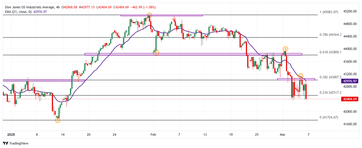 El índice Dow Jones cae un 1.37% diario, operando el momento de escribir sobre 42.414.