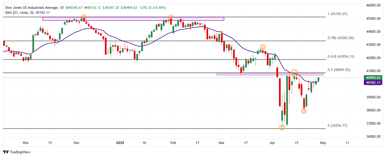 El Dow Jones estableció un mínimo del día en 40.187 donde encontró compradores agresivos que impulsaron el índice a máximos del 16 de abril en 40.461.