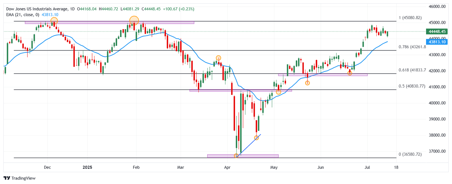 El Dow Jones reaccionó al alza de mínimos del 1 de julio en 44.081, encontrando compradores que llevaron el índice a un máximo del día en 44.453.
