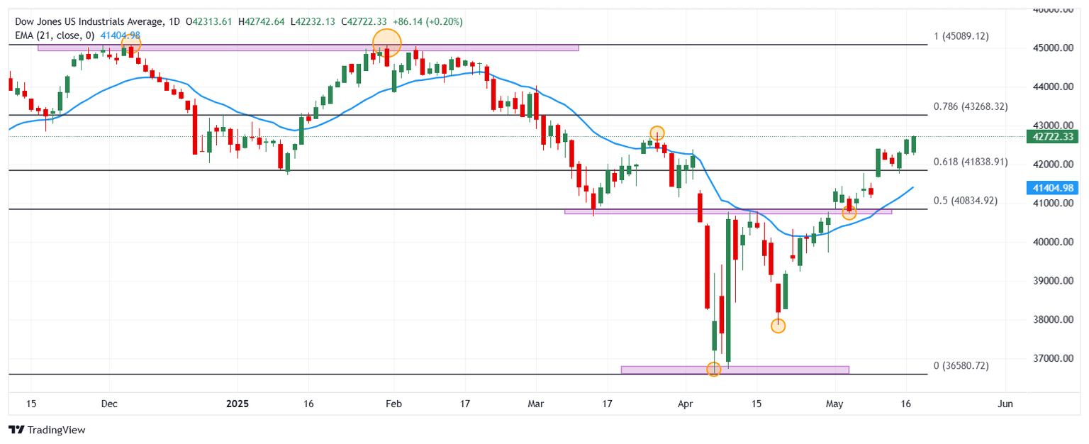 El Dow Jones marcó un máximo diario en 42.646, encontrando vendedores que llevaron el índice a mínimos del 15 de mayo en 42.232.