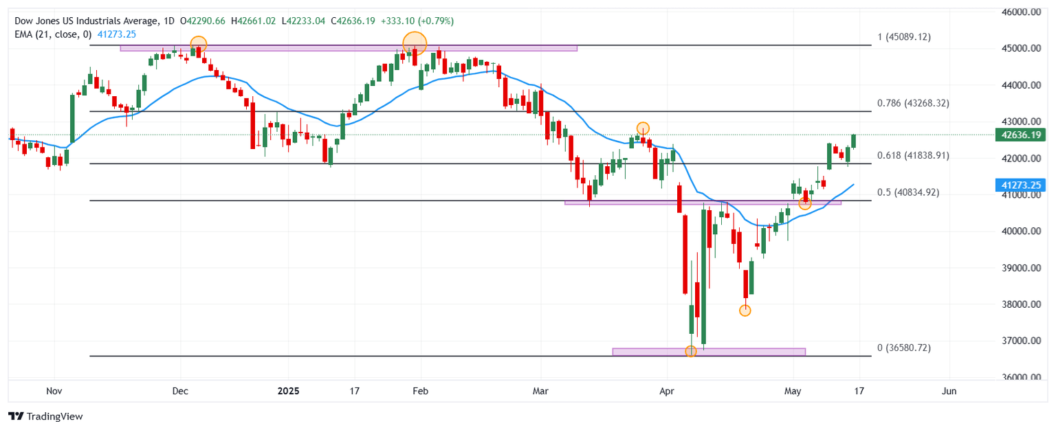 En este escenario, el Dow Jones avanza 333 puntos, alcanzando máximos del 26 de marzo en 42.661.