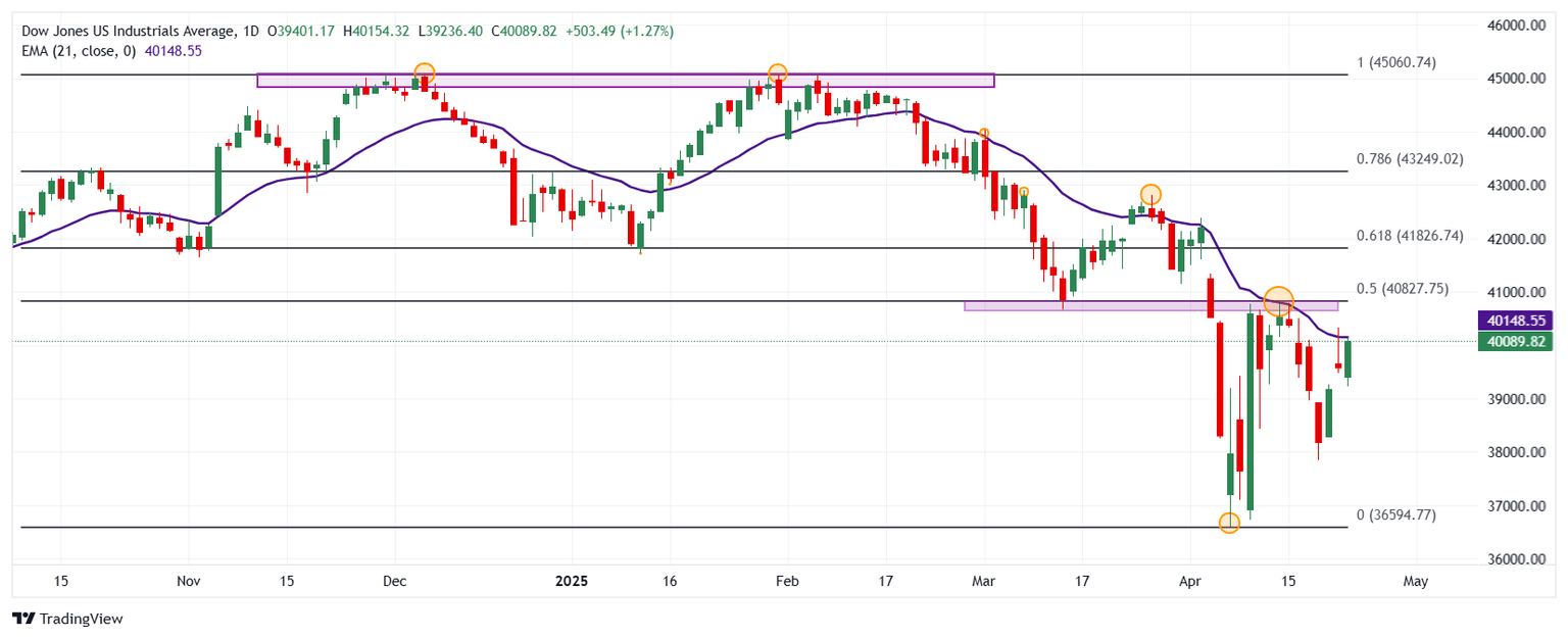 El Dow Jones estableció un soporte de corto plazo dado por el mínimo del 21 de abril en 37.853. Al alza, la resistencia más cercana la observamos en 40.774, máximo del 14 de abril. La siguiente resistencia clave está en 42.820, punto pivote del 26 de marzo.