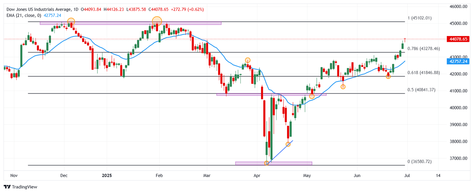 El Dow Jones gana 272 puntos, alcanzando máximos del 21 de febrero en 44.126.