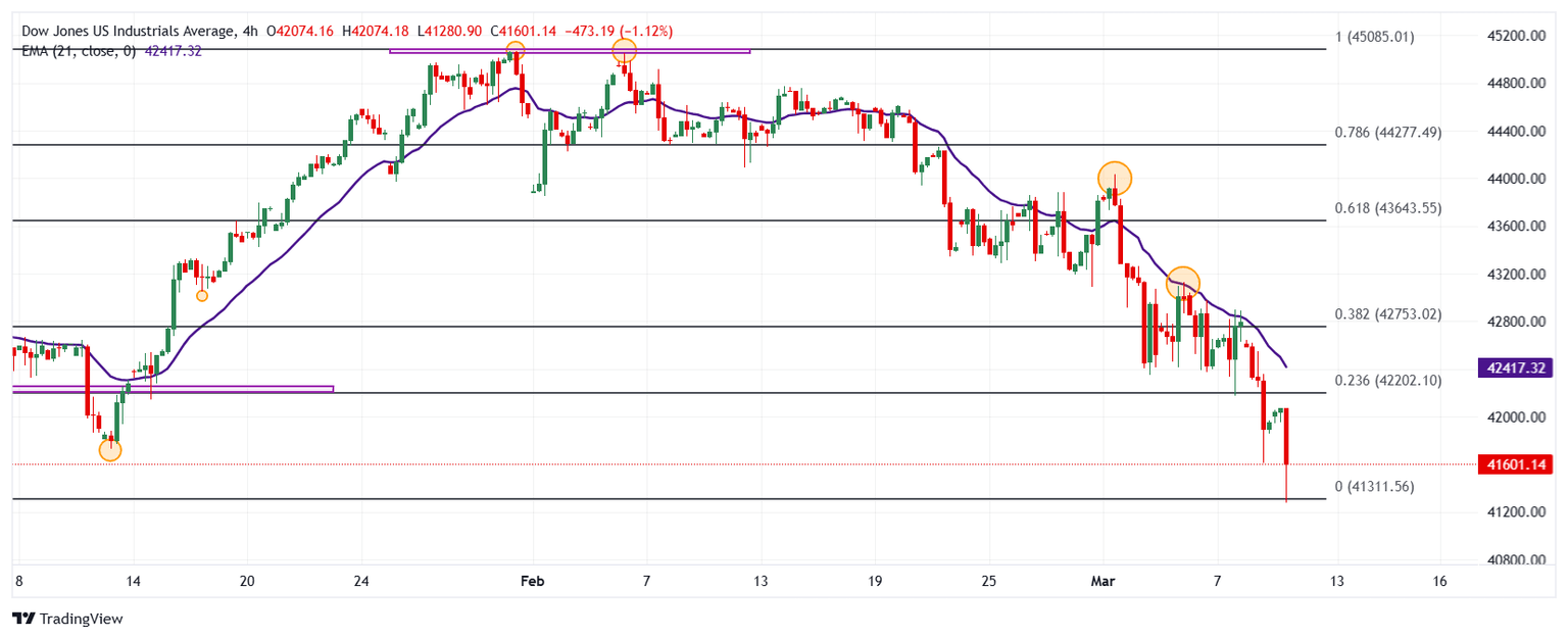 El Dow Jones firma su segunda sesión consecutiva con pérdidas, alcanzando niveles no vistos desde el 13 de septiembre de 2024 en 41.280.