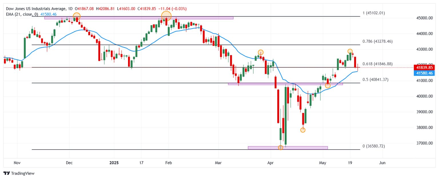 El índice Dow Jones pierde un 0.03% en el día, llegando a mínimos del 12 de mayo en 41.603.