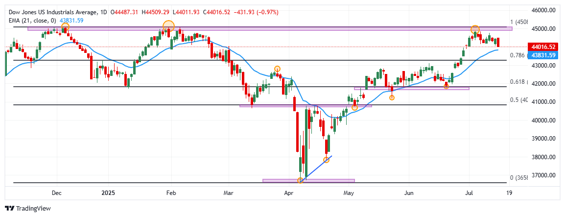 El Dow Jones reaccionó a la baja desde máximos del 11 de Julio en 44.509, donde atrajo vendedores agresivos que arrastraron el índice a mínimos del 1 de julio en 44.011.