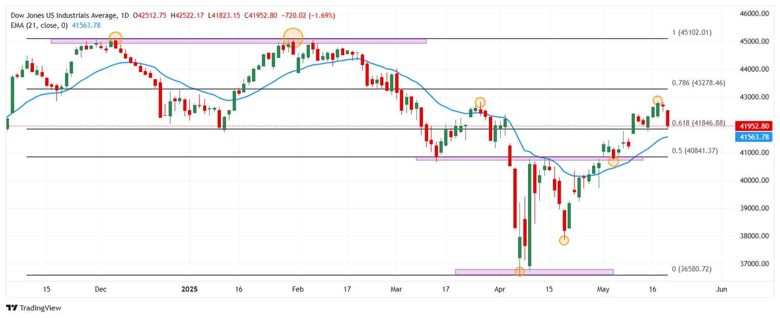 El Dow Jones formó una resistencia de corto plazo dada por el máximo del 19 de mayo en 42.832. La siguiente resistencia clave se encuentra en 45.068, punto pivote del 31 de enero. A la baja, el soporte más cercano se encuentra en 40.747, mínimo del 6 de mayo, en convergencia con el retroceso al 50% de Fibonacci.