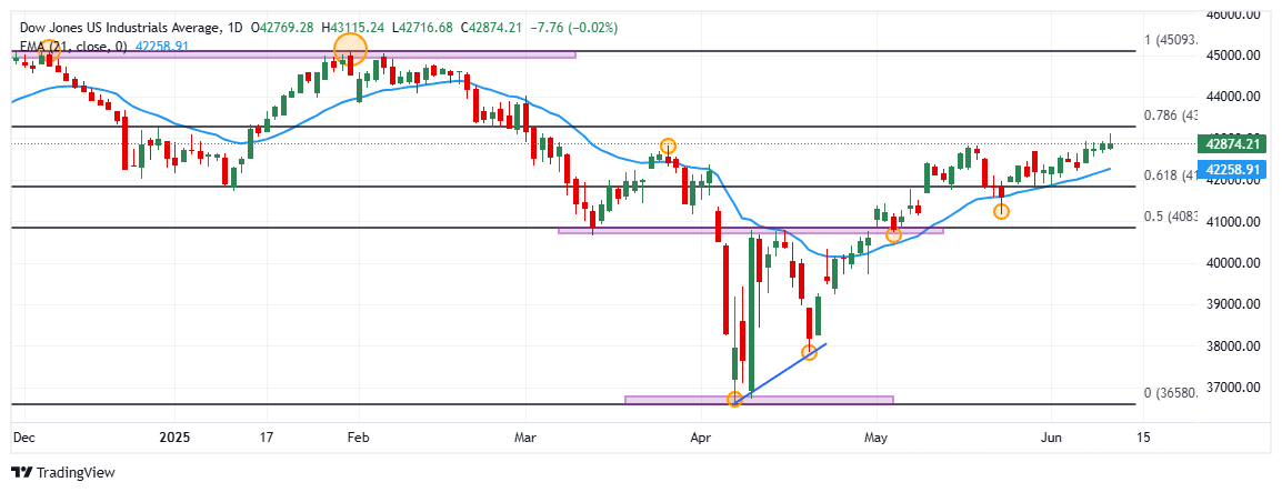 El índice Dow Jones se desliza un 0.02% en la jornada del miércoles, operando en estos momentos en 42.874.