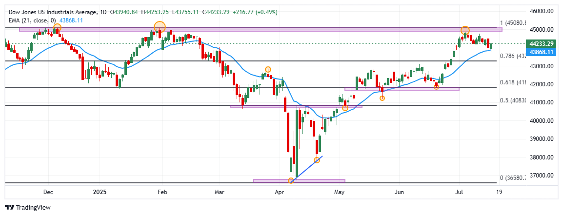 - El Dow Jones gana un 0.49% diario, rebotando desde mínimos del 27 de junio en 43.755.
