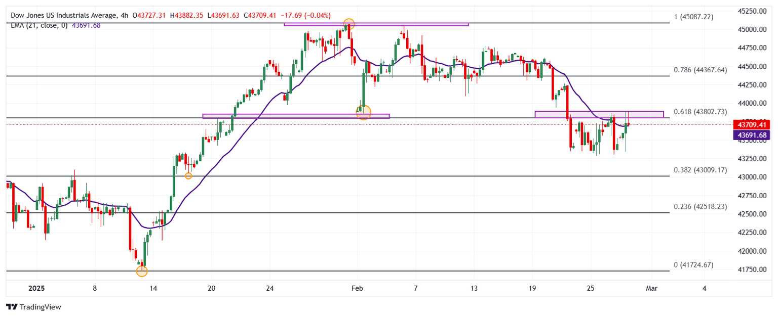 El Dow Jones formó una resistencia de corto plazo dada por el máximo del 27 de febrero en 43.882. en convergencia con el retroceso al 61.8% de Fibonacci. La siguiente resistencia clave la observamos en 45.068, punto pivote del 31 de enero. A la baja, el soporte clave se encuentra en 41.731, mínimo del 13 de enero.