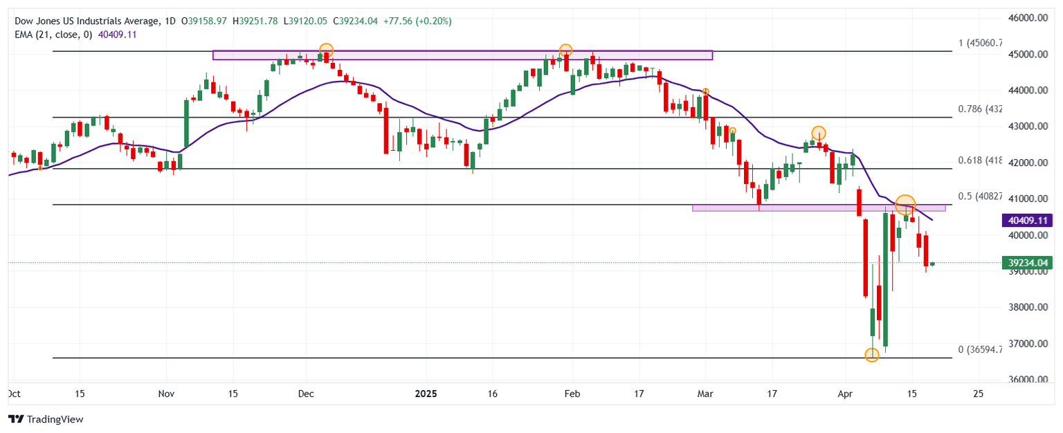 El Dow Jones reaccionó a la baja desde una resistencia de corto plazo dada por el máximo del 14 de abril en 40.774. La siguiente resistencia clave está en 42.820 máximo del 26 de marzo. Al sur, el soporte se encuentra en 36.614, punto pivote del 7 de abril.