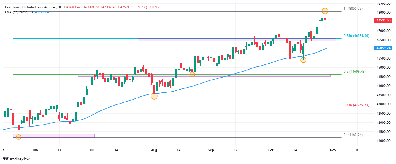 El Dow Jones marcó un mínimo del día en 47.382, encontrando compradores que impulsaron el índice a un máximo diario en 48.008.