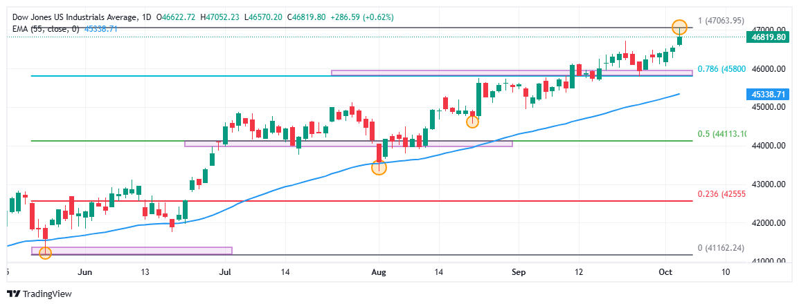 El Dow Jones marcó un mínimo del día en 46.570, atrayendo compradores agresivos que impulsaron el índice a nuevos máximos históricos en 47.052.
