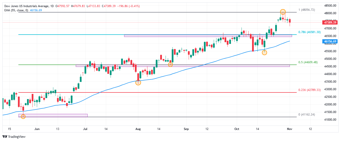 El Dow Jones registró un máximo del día en 47.679, encontrando vendedores que llevaron el índice a mínimos del 24 de octubre en 47.133.