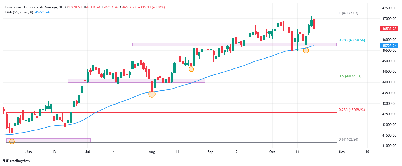 El índice Dow Jones retrocede un 0.77% en el día, cotizando actualmente sobre 46.562.
