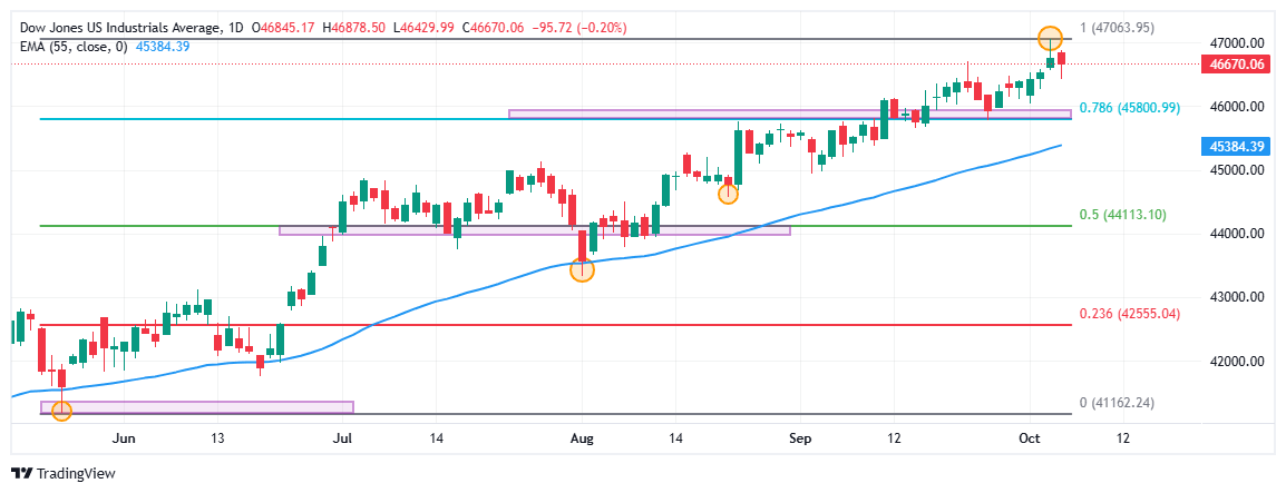 El Dow Jones estableció un máximo diario en 46.878, donde encontró vendedores agresivos que arrastraron el índice a mínimos de dos jornadas en 46.429.