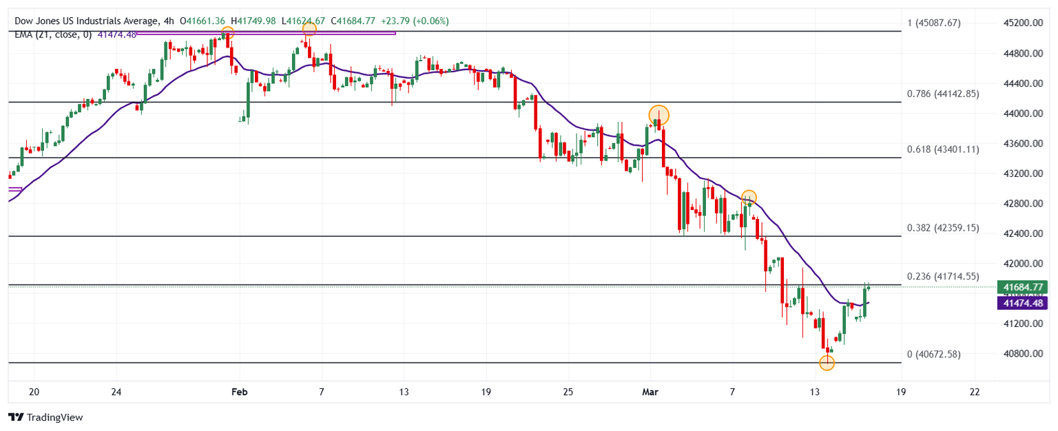 El Dow Jones estableció un mínimo diario en 41.217, encontrando compradores que llevaron el índice a máximos del 12 de marzo en 41.749.