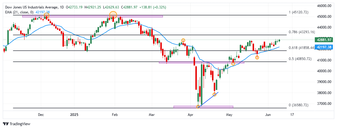 El índice Dow Jones avanza un 0.32% en el día, cotizando actualmente sobre 42.881.