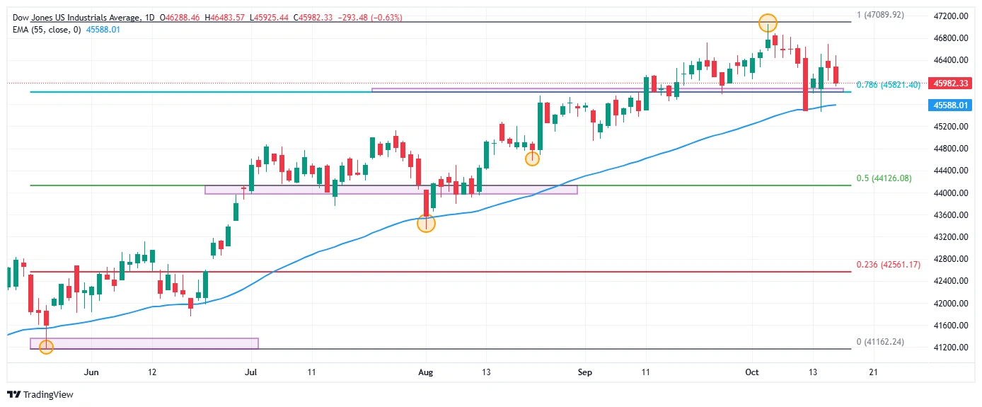 En este escenario, el Dow Jones retrocede 280 puntos, visitando mínimos del 15 de octubre en 45.925.