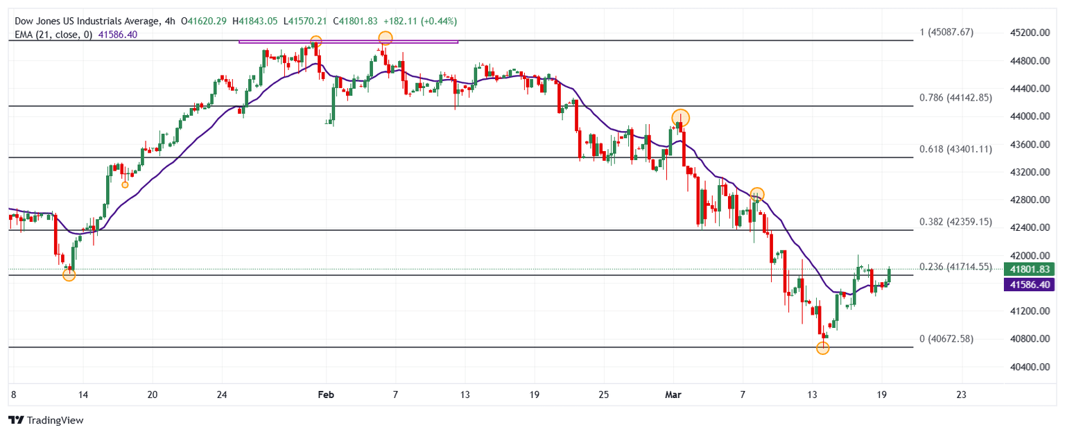 El Dow Jones estableció un soporte de corto plazo dado por el mínimo del 13 de marzo en 40.993. Al alza, la resistencia más cercana la observamos en 44.033, dada por el máximo del 3 de marzo. La siguiente resistencia clave la observamos en 45.068, punto pivote del 31 de enero.