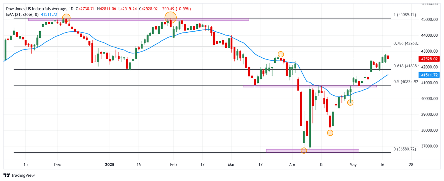 El índice Dow Jones retrocede un 0.60% el día de hoy, alcanzando un mínimo del día en 42.511.