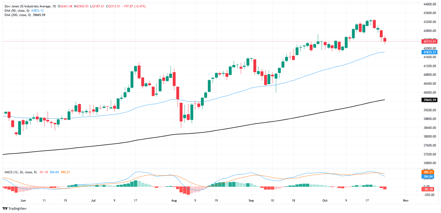 El gráfico diario del Promedio Industrial Dow Jones (DJIA) refleja un retroceso bajista después de alcanzar un pico cerca de 43.600. El índice ha caído a 42.331, mostrando una serie de velas bajistas mientras se acerca a la EMA de 50 días, actualmente en 41.833.