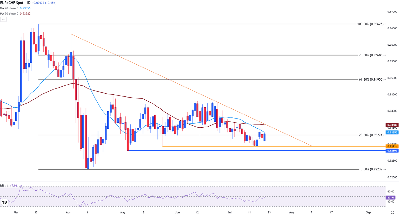 Con el EUR/CHF actualmente probando el nivel de retroceso de Fibonacci del 23.6% de la caída de marzo-abril en 0.9327, la línea de tendencia descendente del repunte de abril se mantiene intacta, reforzando un sesgo bajista más amplio.