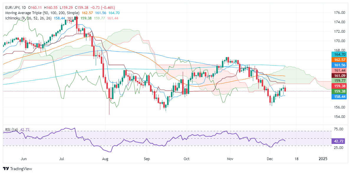 El EUR/JPY extendió sus pérdidas por debajo de 160.00, con los operadores observando una nueva prueba del mínimo del 11 de diciembre de 158.64. En caso de mayor debilidad, el cruce podría caer hacia el Tenkan-Sen en 158.45, antes de deslizarse a 158.00.