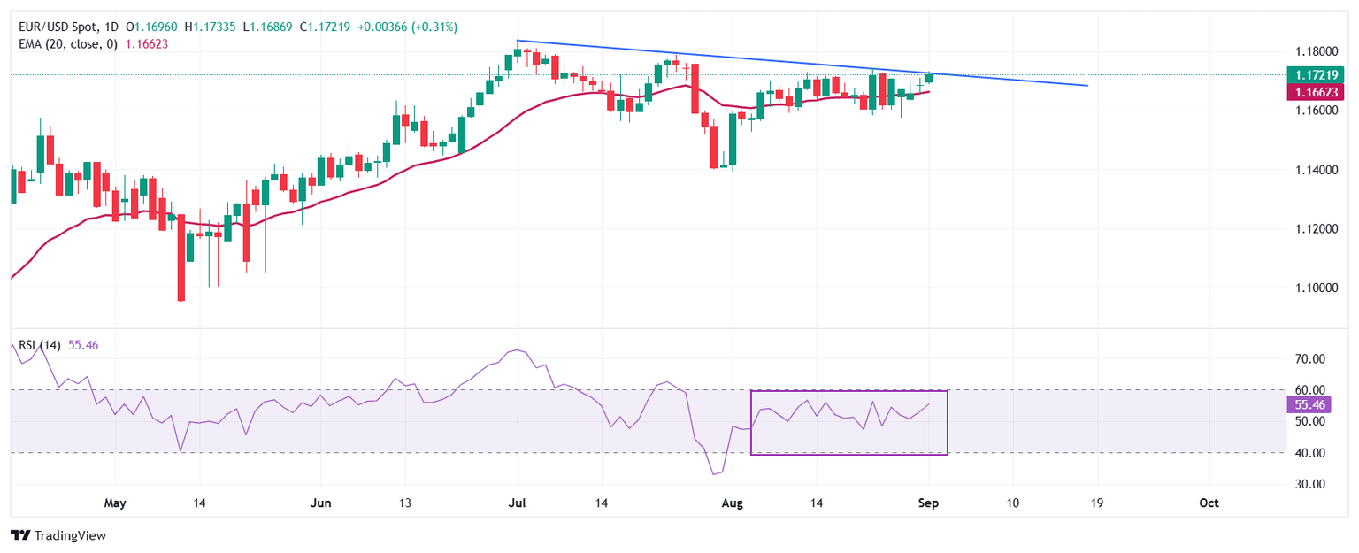 El EUR/USD cotiza cerca de 1.1730, acercándose a una línea de tendencia descendente trazada desde el máximo de julio en 1.1830. La tendencia a corto plazo del par es alcista ya que se mantiene por encima de la Media Móvil Exponencial (EMA) de 20 días, que cotiza cerca de 1.1662.