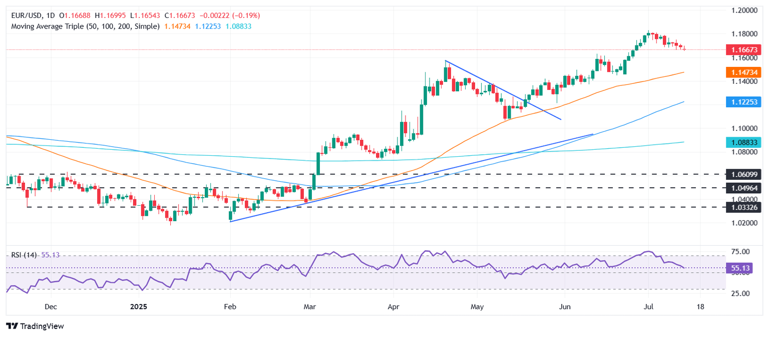 El EUR/USD se mantiene presionado durante la sesión norteamericana, por debajo de la cota de 1.1700, ya que el Dólar se vio impulsado por la revelación de Trump de nuevas cartas de aranceles a dos de sus mayores socios comerciales, aumentando el apetito por activos refugio. En el momento de escribir, el par cotiza en 1.1667, bajando un 0.15%.