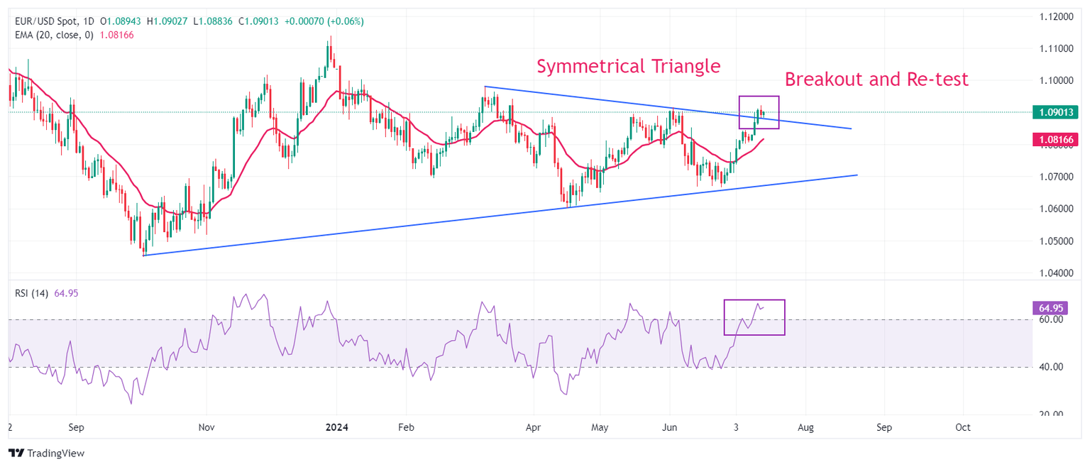 El EUR/USD prueba la región de ruptura de la formación del Triángulo Simétrico en un marco de tiempo diario cerca de 1.0880. Una ruptura del patrón de gráfico mencionado resulta en ticks más amplios y un volumen pesado. La perspectiva a corto plazo del par de divisas principal es alcista ya que la media móvil exponencial (EMA) de 20 días cerca de 1.0816 está inclinada al alza.