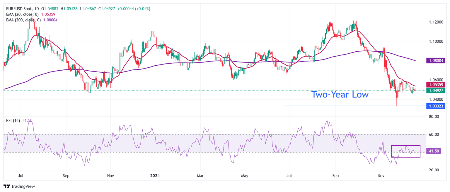 El EUR/USD ha cotizado de ida y vuelta alrededor de la cifra psicológica de 1.0500 durante los últimos cinco días de negociación. El par de divisas principal enfrenta presión cerca de la Media Móvil Exponencial (EMA) de 20 días, que cotiza alrededor de 1.0535, lo que sugiere que la tendencia a corto plazo es bajista.