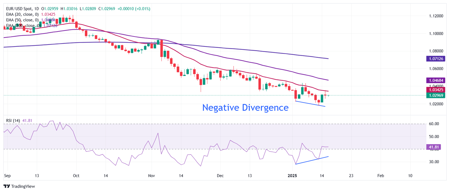 El EUR/USD mantiene el rebote cerca de 1.0300 después de ganar terreno desde el mínimo de más de dos años de 1.0175 alcanzado el lunes. El par de divisas principal rebota en la divergencia de momentum y acción del precio. El Índice de Fuerza Relativa (RSI) de 14 días formó un mínimo más alto cerca de 35.00, mientras que el par hizo mínimos más bajos.